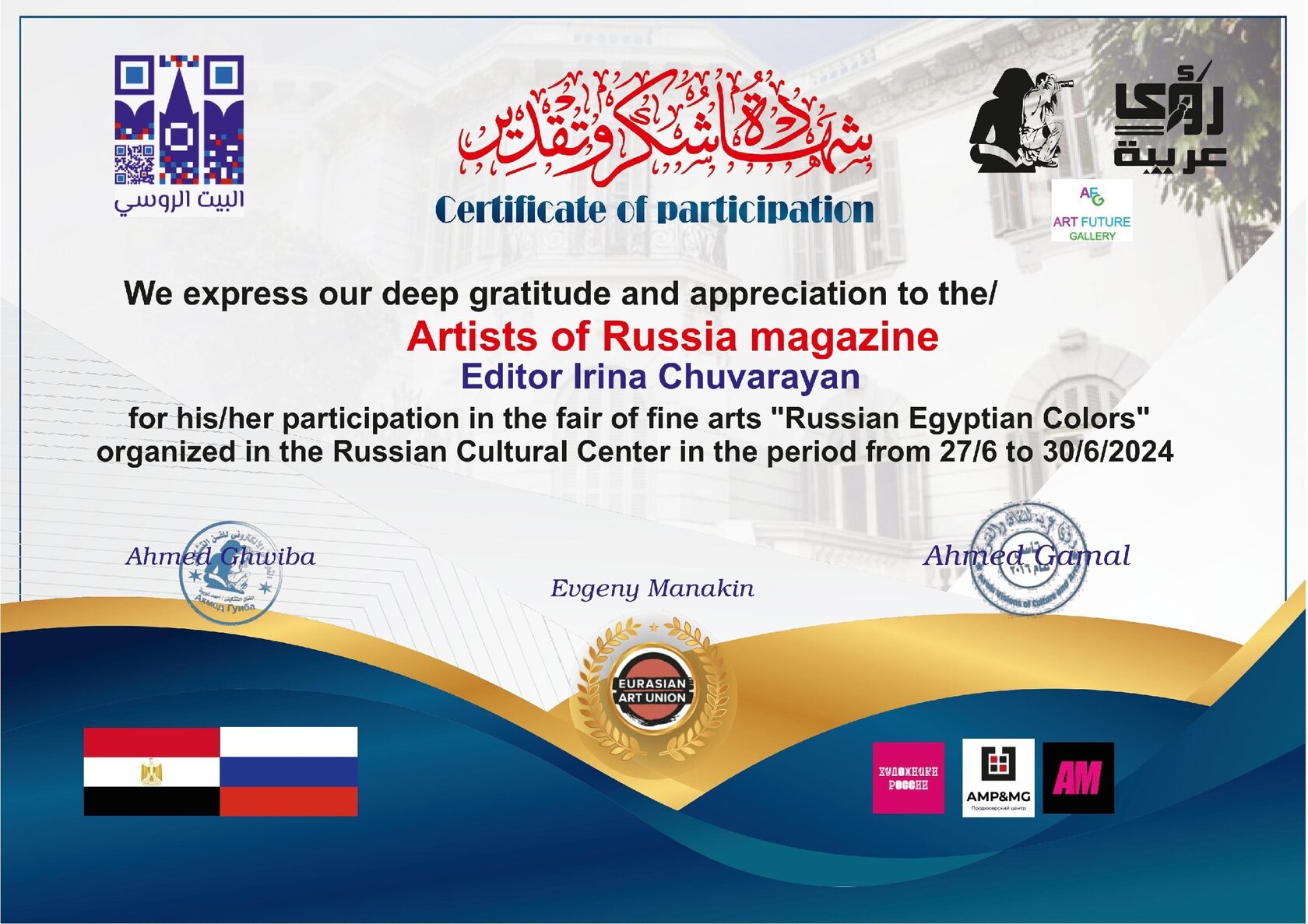 30 художников-резидентов стали участниками Международной выставки «Русские и Египетские краски».Как отметила издатель и главный редактор журналов Ирина Чувараян: «Первоочередная задача сейчас для творческих людей — объединяться и на языке искусства и творчества менять сознание, нести культуру в массы, говорить об истинных ценностях. У данной выставки большая задача и великая миссия, так необходимая сейчас — радовать и наполнять счастьем, дарить любовь! И, конечно, общими усилиями все получилось! Благодарны Русскому дому в Каире за возможность донести эту любовь, красоту, добрый свет!»
